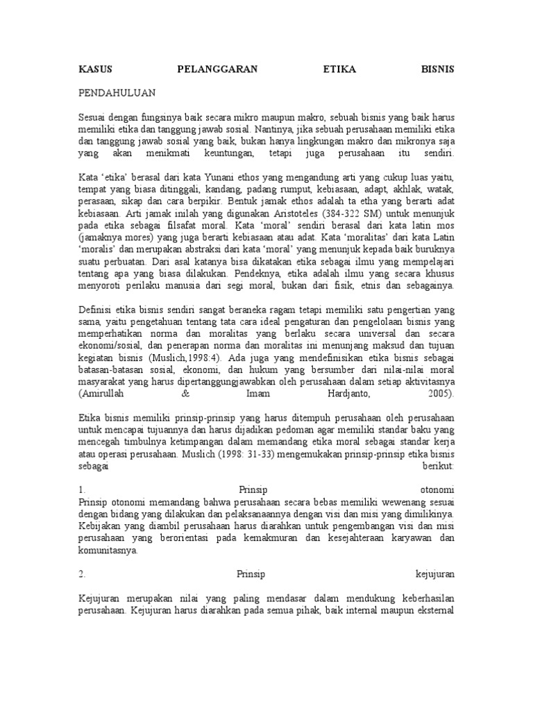 Kasus etika bisnis di indonesia. Beberapa contoh kasus pelanggaran etika bisnis yang diurai dalam buku hoffman di antaranya : Contoh kasus pelanggaran etika di masyarakat dan solusinya nama : Kidangen henoch ” pelanggaran hukum dan etika bisnis pt freeport indonesia” (2014) hamsky, ratih.